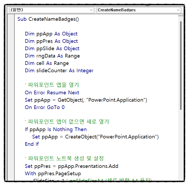 엑셀 파일에서 "CreateNameBadges" 서브루틴을 실행하려면 Alt + F8을 눌러서 매크로 실행 창을 열고, "CreateNameBadges"를 선택한 후 실행합니다.